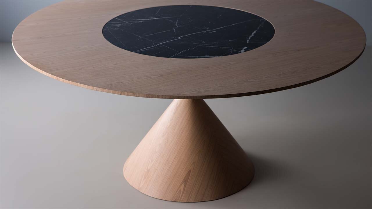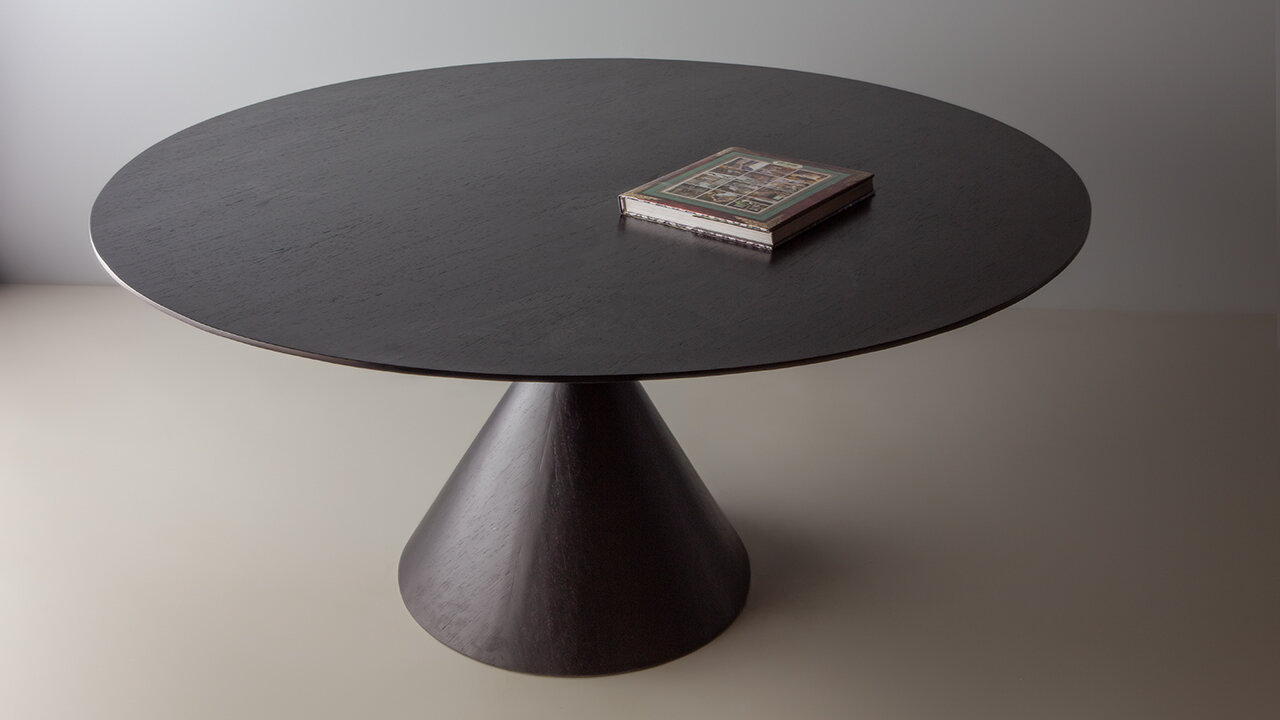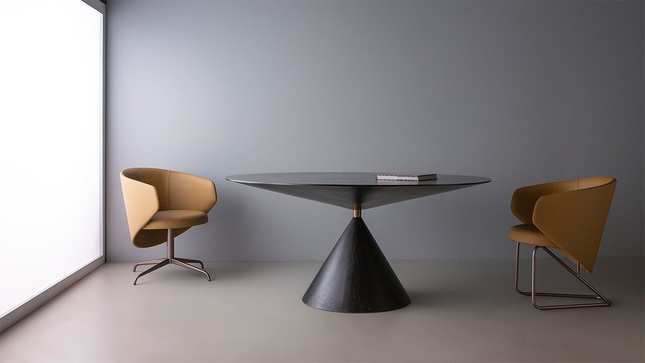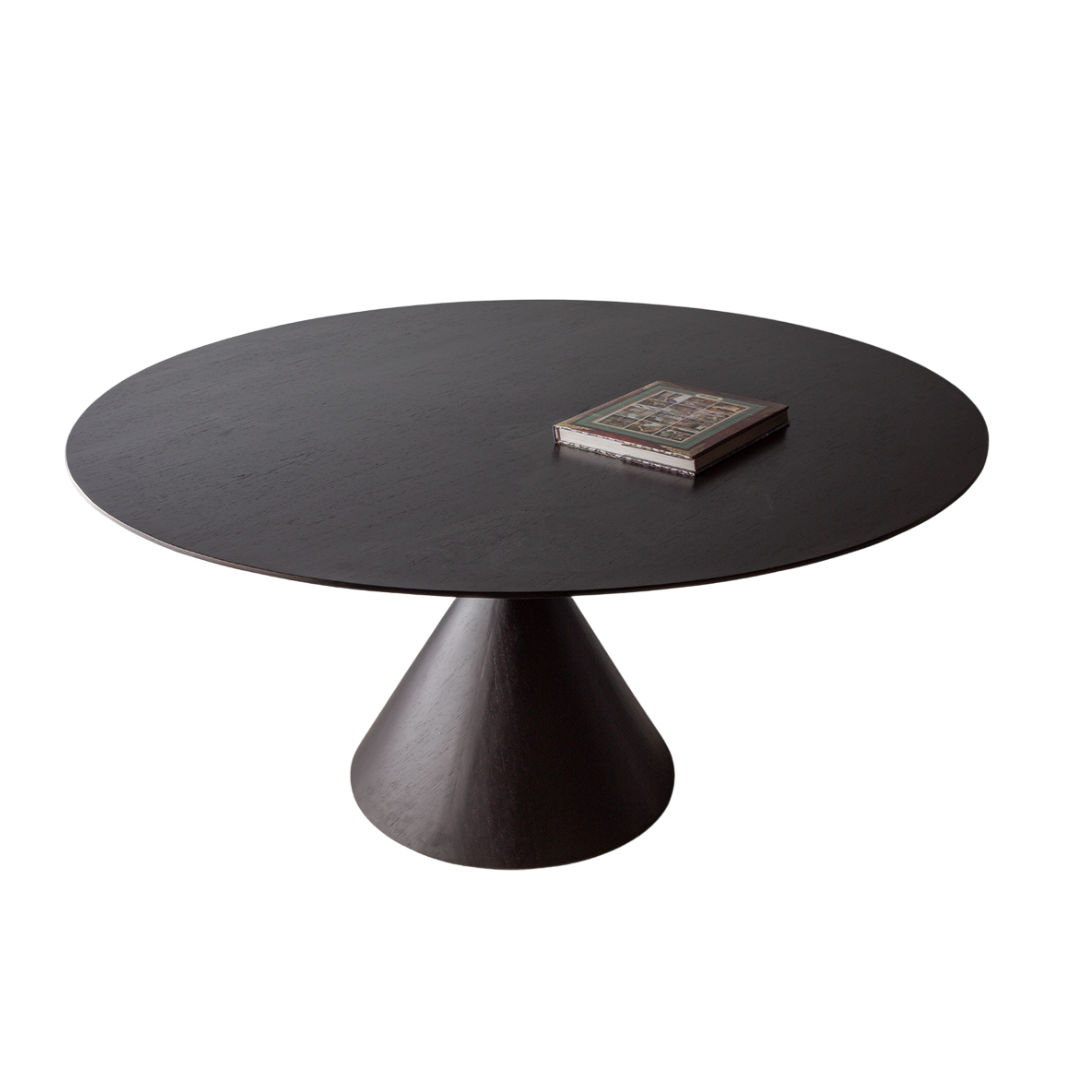 Mesa com base e tampo em carvalho preto e detalhe do aço envelhecido.