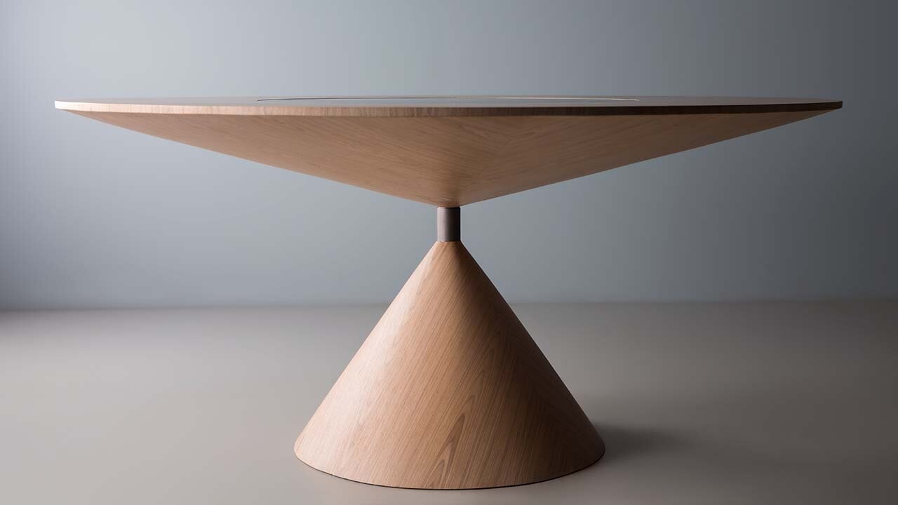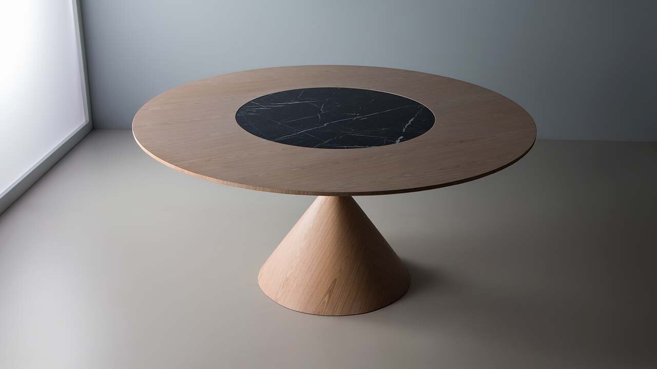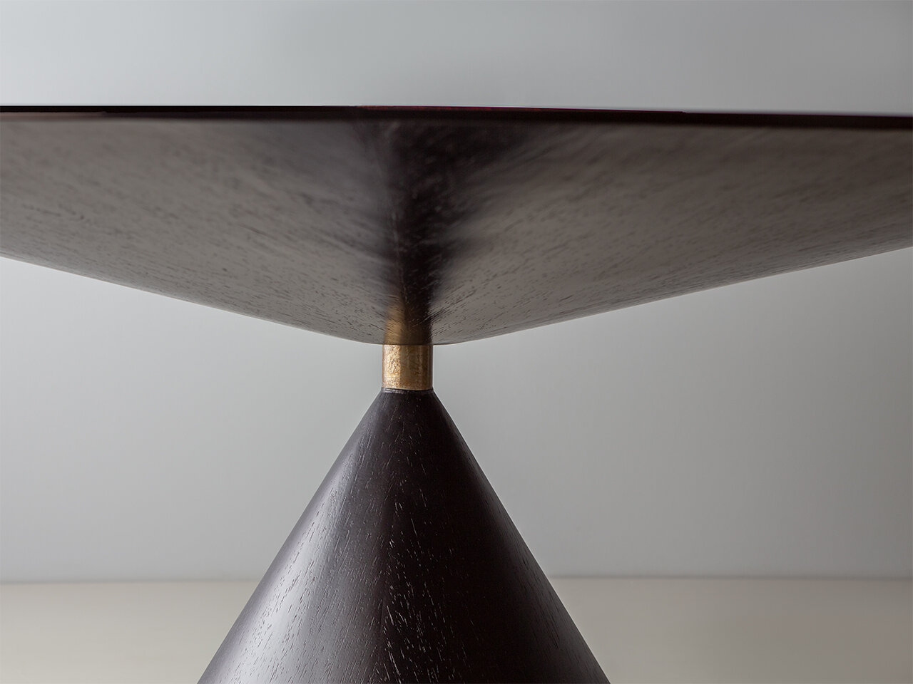 Mesa com base e tampo em carvalho preto e detalhe do aço envelhecido.