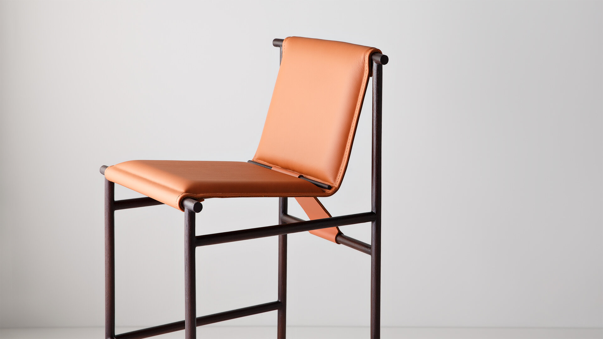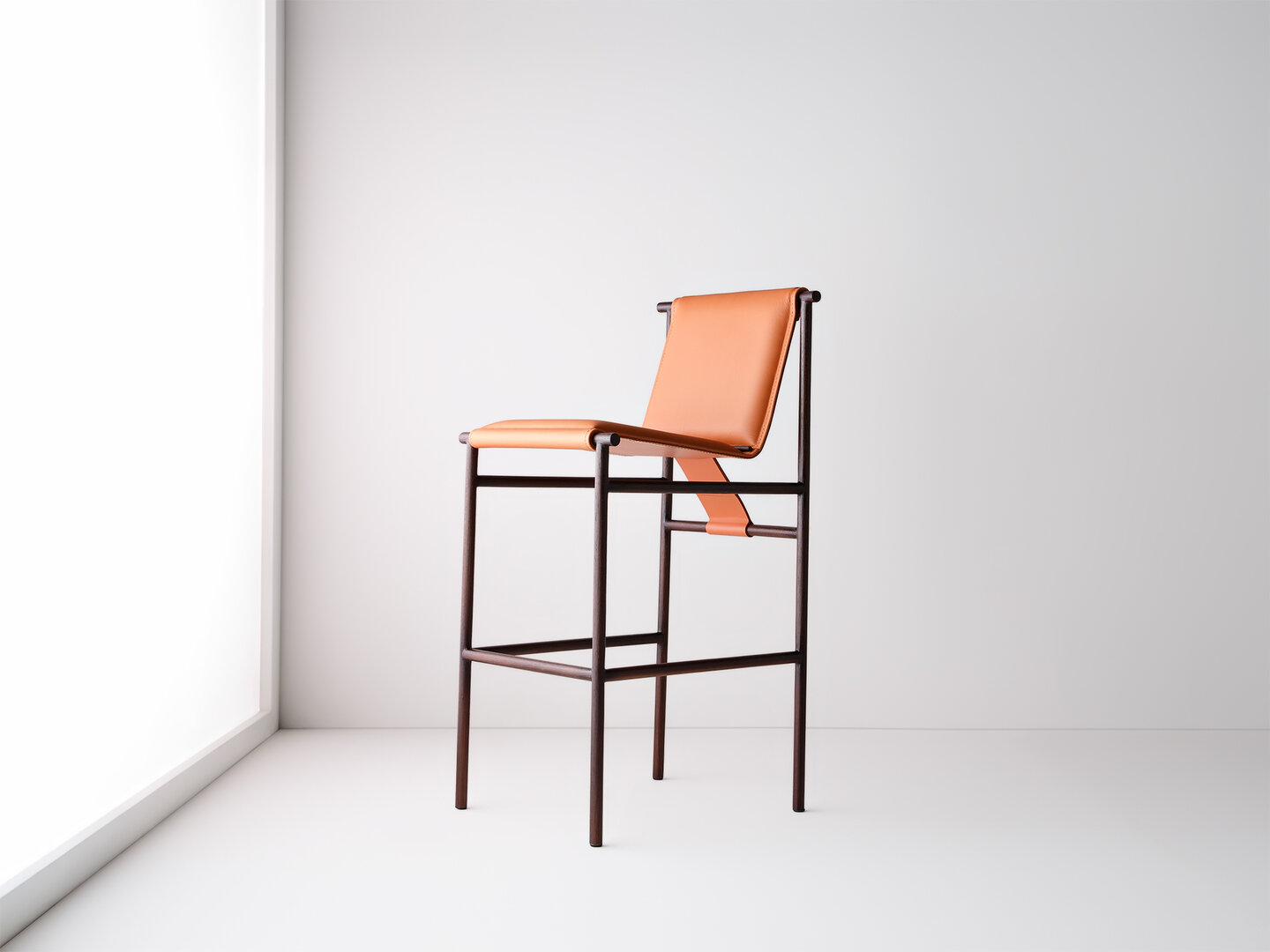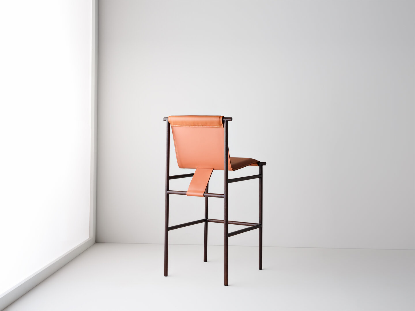 A banqueta Tenda da é um móvel de design moderno com estrutura em metal resistente e assento estofado em soleta, que combina conforto e sofisticação. Ela foi projetada pelo designer Tiago Curioni e faz parte do lançamento de 2025 da marca.
